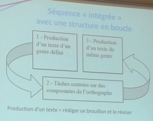 En ce qui concerne l’orthographe, Linda Allal (Université de Genève) est dans la même ligne que son collègue Patrice Gourdet, elle pose le cadre tout de suite : son postulat de base est que les activités de production écrite (apprentissage intégré et non plus spécifique) assurent la structuration progressive des compétences orthographiques des élèves. Elle précise toutefois que les élèves ont besoin d’exercices réguliers (dont la dictée) “hors contexte” avec alternance de production pour initier les élèves à utiliser l’orthographe en contexte.